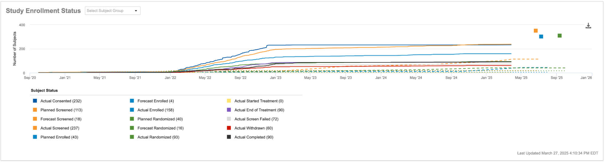 For Studies tracking Enrollment Metrics for Subject Groups, select a Subject Group from the picklist to filter the Enrollment Status Graph.
